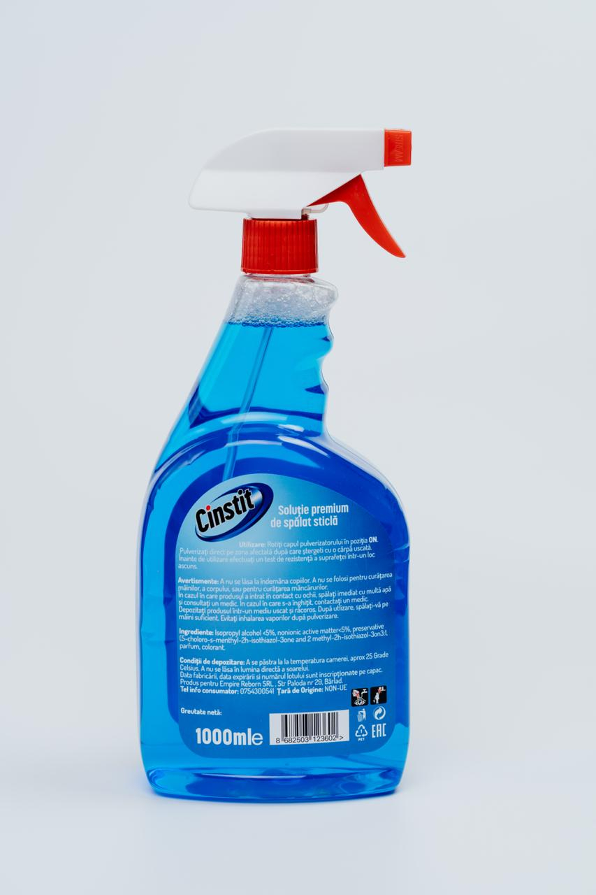 Cinstit® Premium este o solutie profesionala pentru curatarea suprafetelor din sticla, cu formula pe baza de alcool izopropilic pentru curatare rapida, uscarea imediata si stralucire fara urme. Indeparteaza eficient petele, amprentele si depunerile, fiind ideala pentru geamuri, oglinzi si vitrine. Aplicare usoara prin pulverizare si parfum subtil de prospetime.