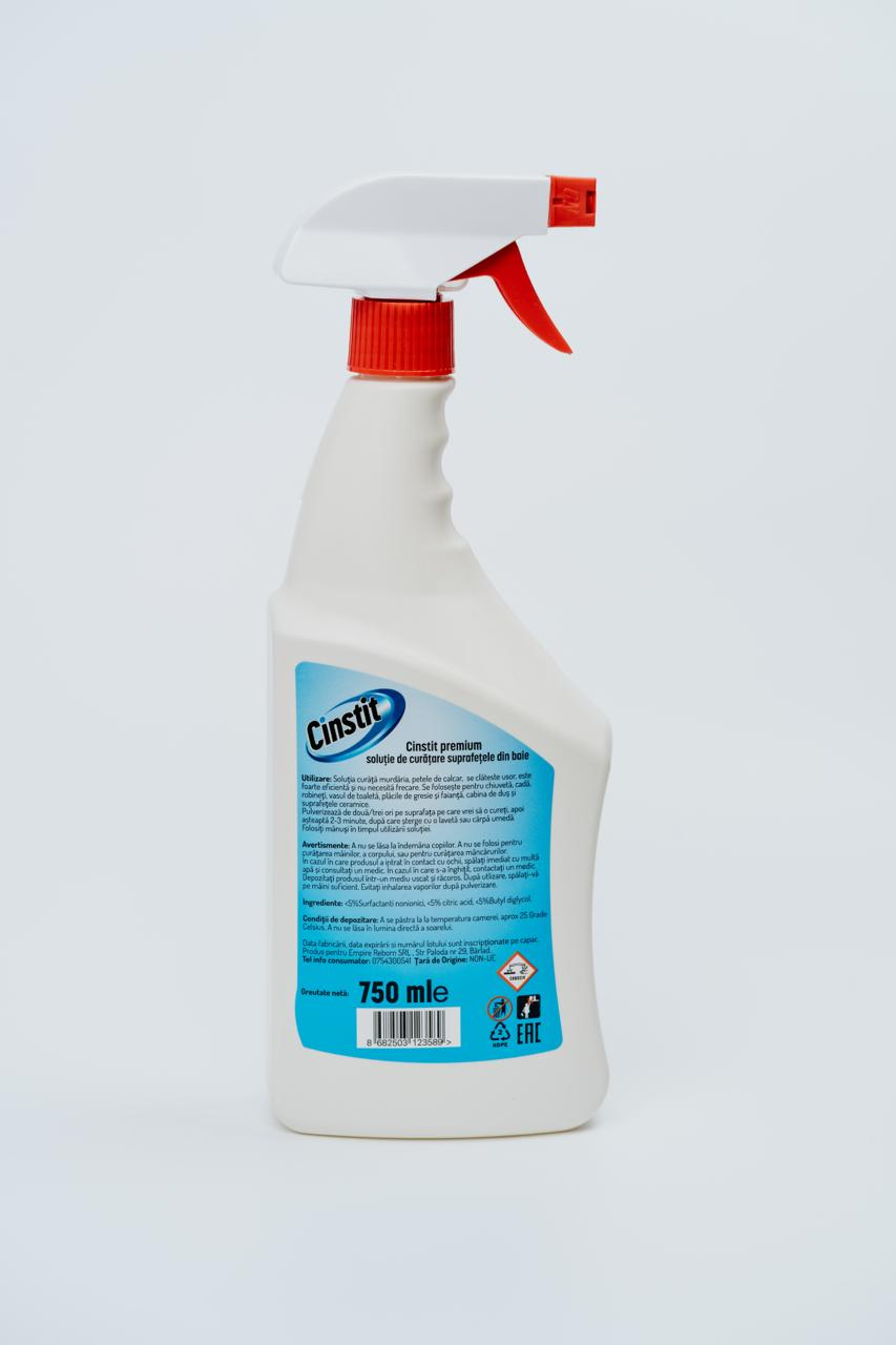 Cinstit Premium este o solutie profesionala pentru curatarea baii, eficienta impotriva calcarului, depunerilor de sapun si murdariei persistente. Formula sa puternica actioneaza rapid, se clateste usor si lasa suprafetele impecabile si improspatate. Ideala pentru chiuvete, cazi, robinete, gresie, faianta si cabine de dus. Aplicare usoara prin pulverizare.
